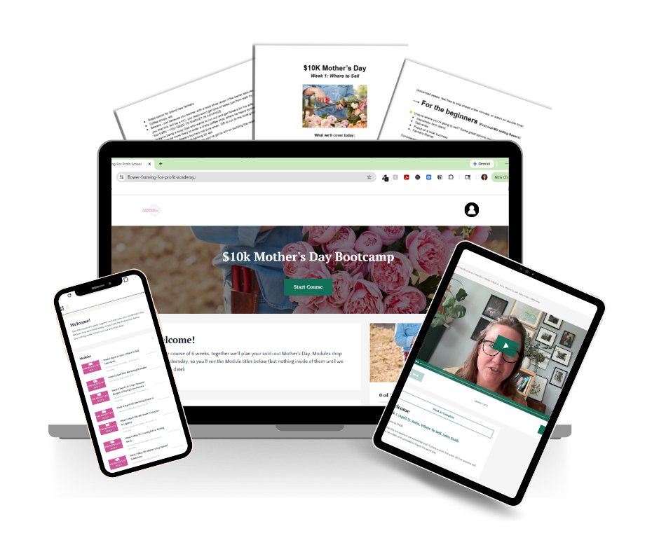 A 6-week live bootcamp that gives you everything you need β bouquet recipes, pricing, marketing strategies, wholesale flower access, and a community of hundreds of farmers doing it with you β so you can have your best Mother's Day yet. Whether it's your tenth season or you've never sold a single flower.