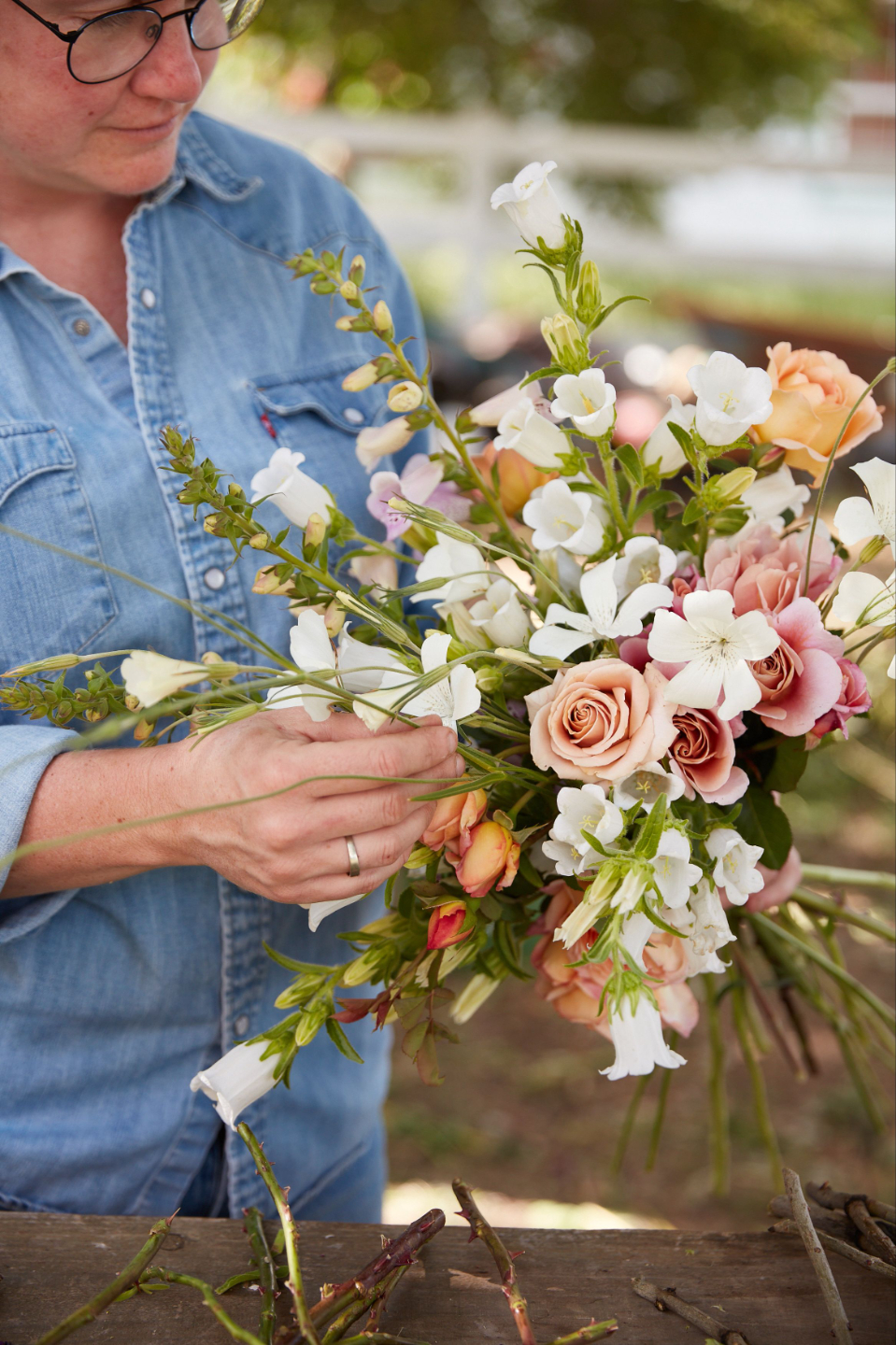 The problem? I didn't have much blooming. So I cut the few flowers I had, grabbed some branches from a shrub in the yard (and β okay, fine β from the supermarket parking lot. Hey, they needed to be pruned!), and set up a little table at a local cafΓ© that was doing a Mother's Day brunch.